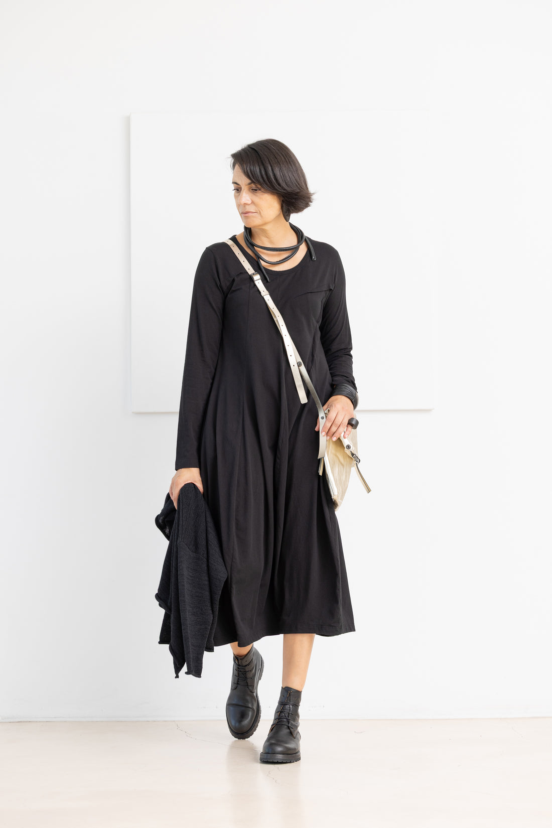 DESCRIPTION - Long and oversized black dress made from soft cotton.- Asymmetrical round neckline in...