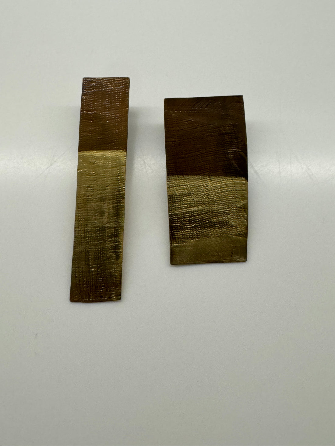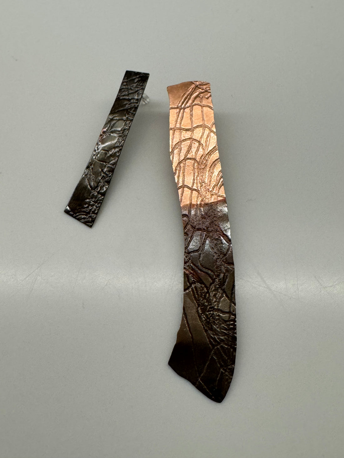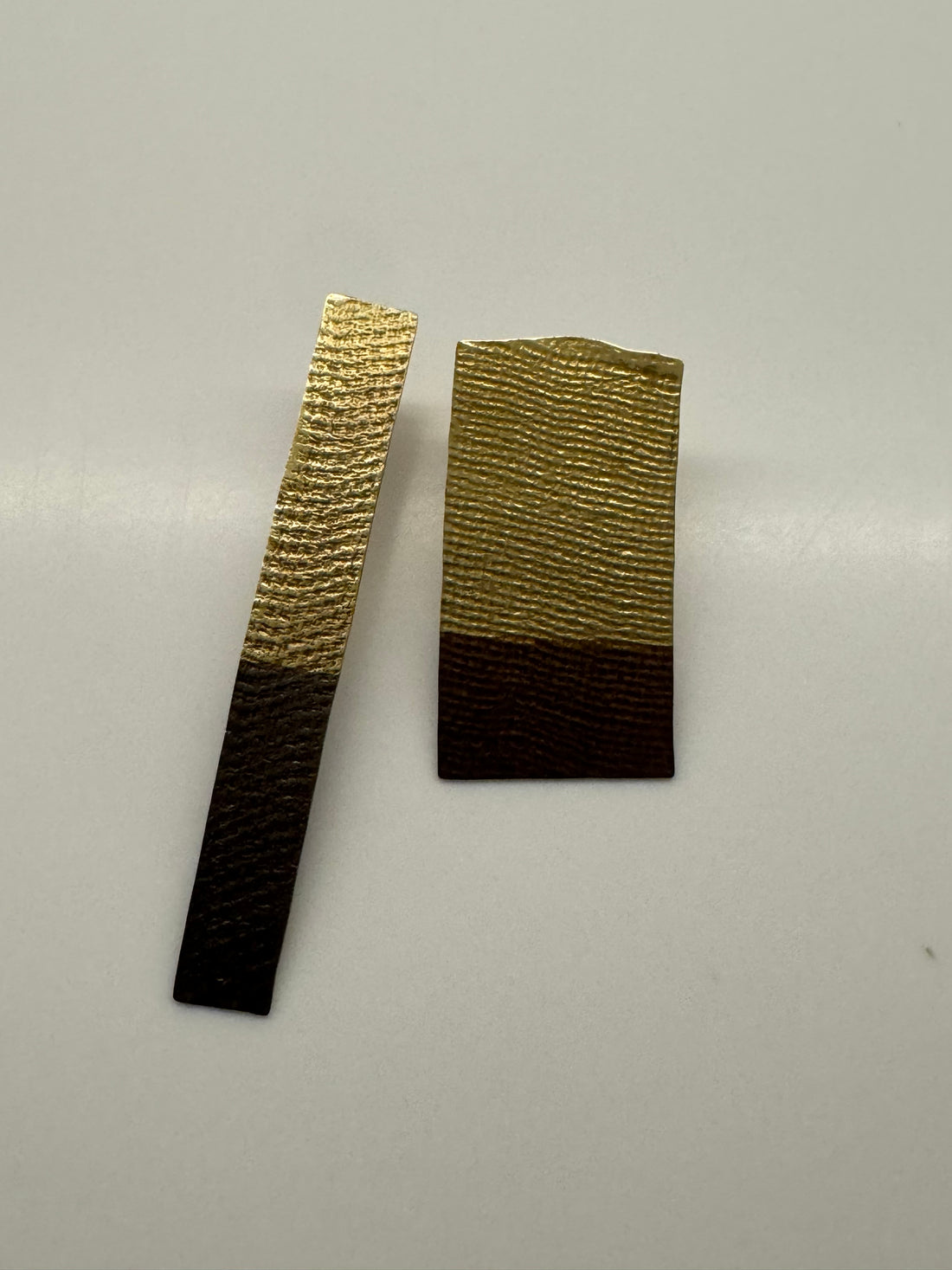 DESCRIPTION - Handmade long blackened brass earrings for pierced ears with hints of gold, featuring...
