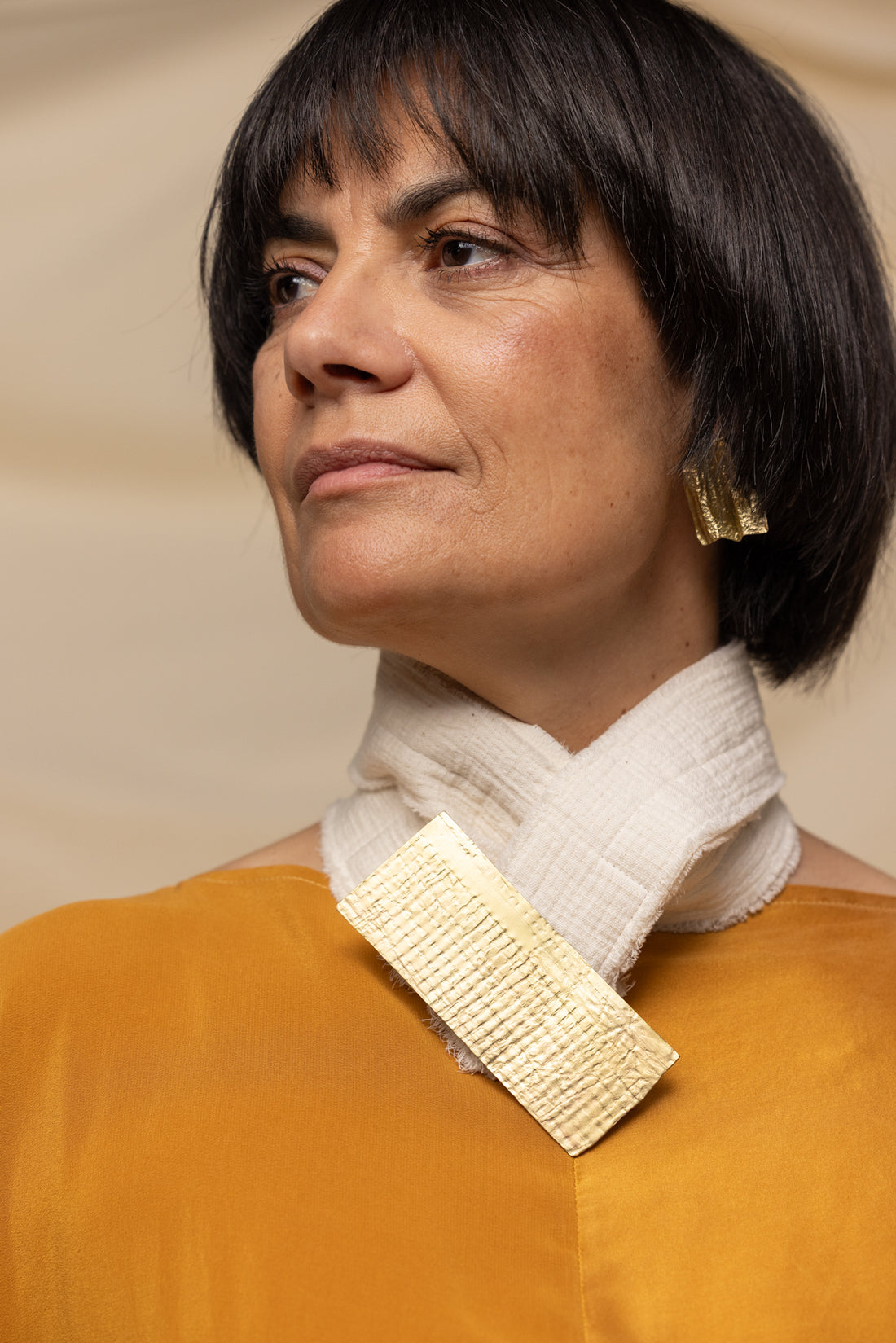 Drawing on the richness of the textiles’ textures, she crafts versatile jewellery designed to be styled in multiple ways, inviting the wearer to become part of the creative process.