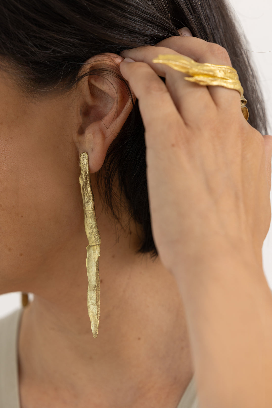 DESCRIPTION - Handmade long earrings for pierced ears, crafted in golden brass with a rustic...