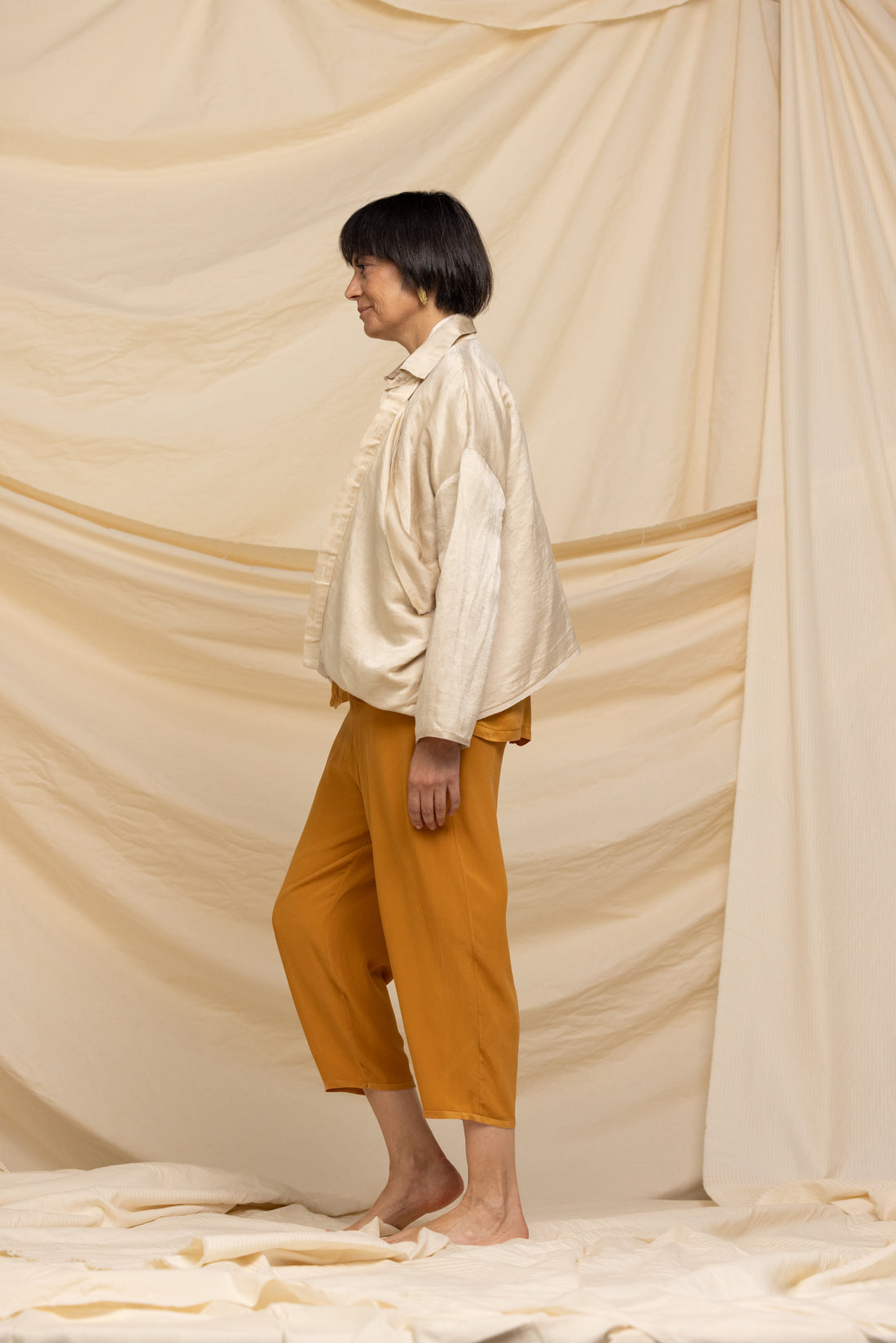 DESCRIPTION - Asymmetrical shirt made from fine high-quality silk. - Hand-dyed with onion skins, making...