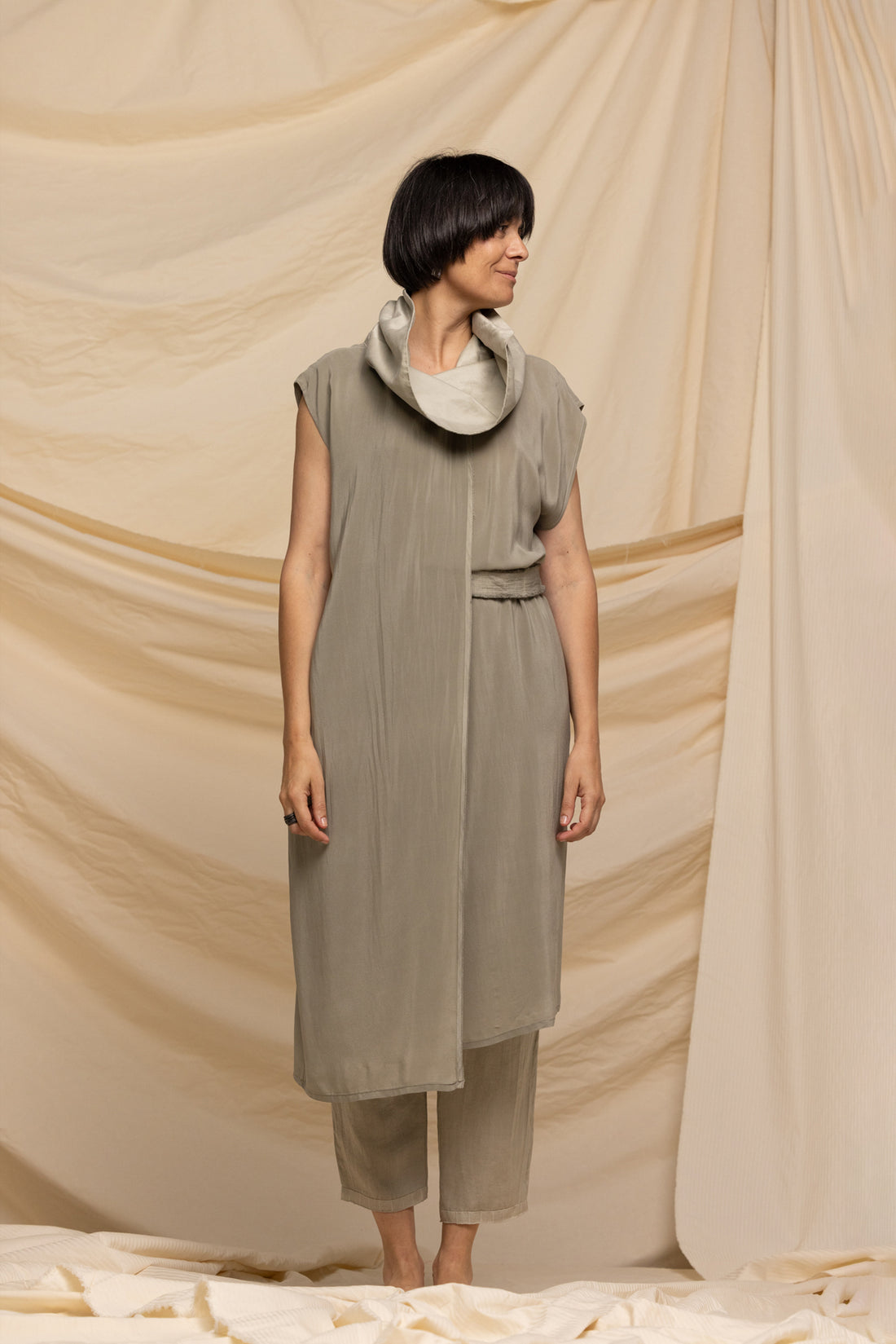 DESCRIPTION - Mid-length dress made from fine silk crepe with a draped high collar. -...
