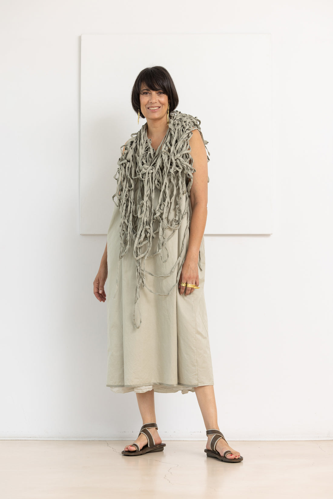 DESCRIPTION - Long dress made from soft cotton in a taupe shade. - Features pleats...