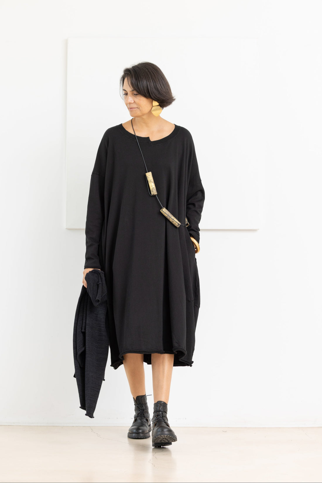 DESCRIPTION - Long and oversized black dress made from soft cotton.- Asymmetrical round neckline in...