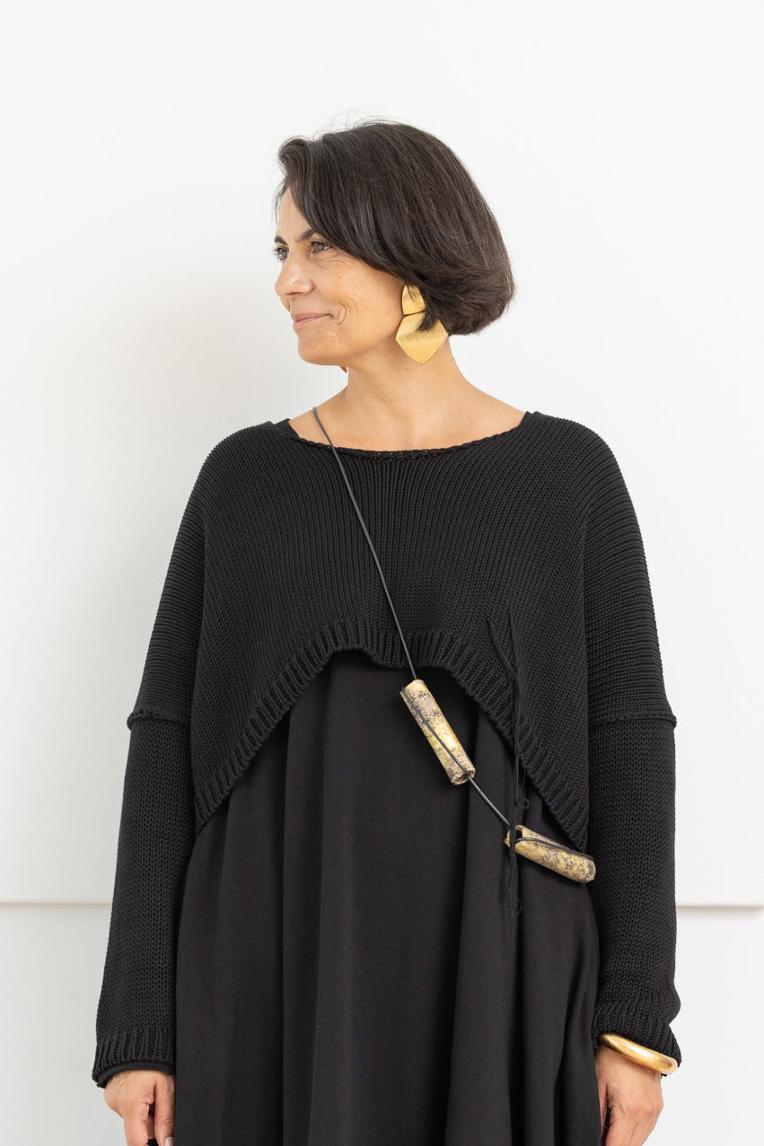 DESCRIPTION - Short black sweater made from fine cotton knit.- Round neckline and dropped shoulders...