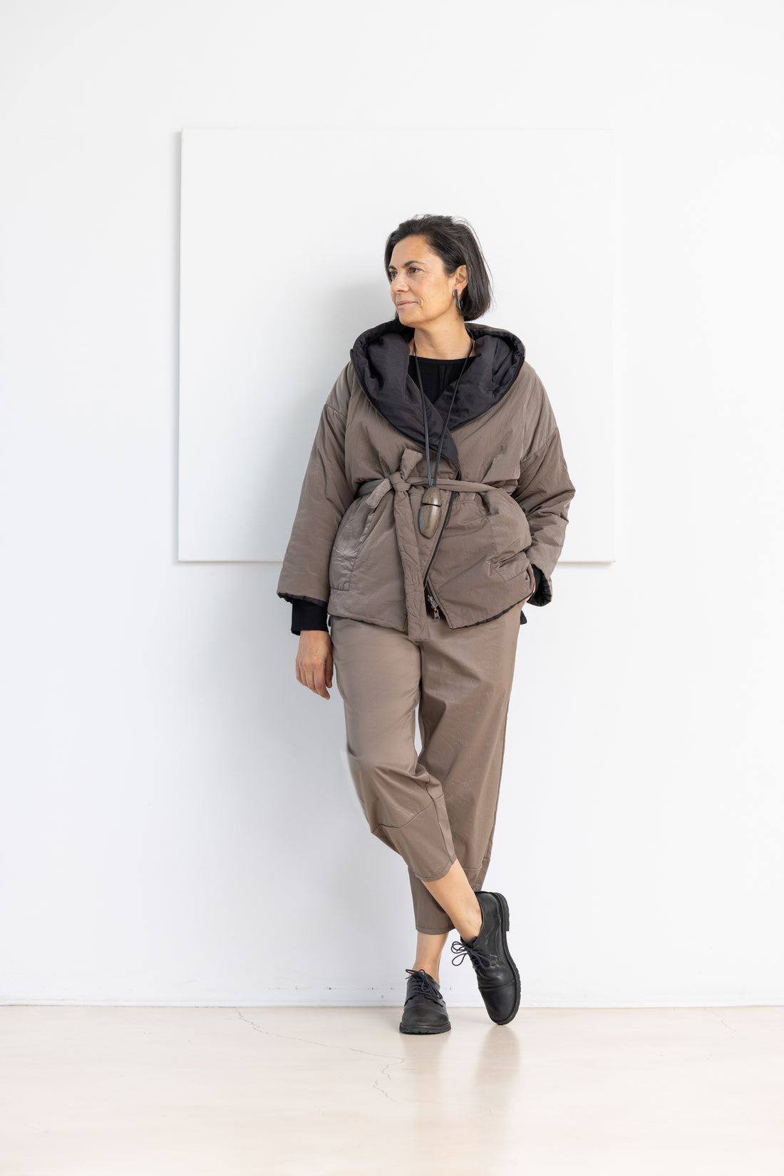DESCRIPCIÓN - Abrigo corto y holgado en color topo, confeccionado con una suave mezcla de...