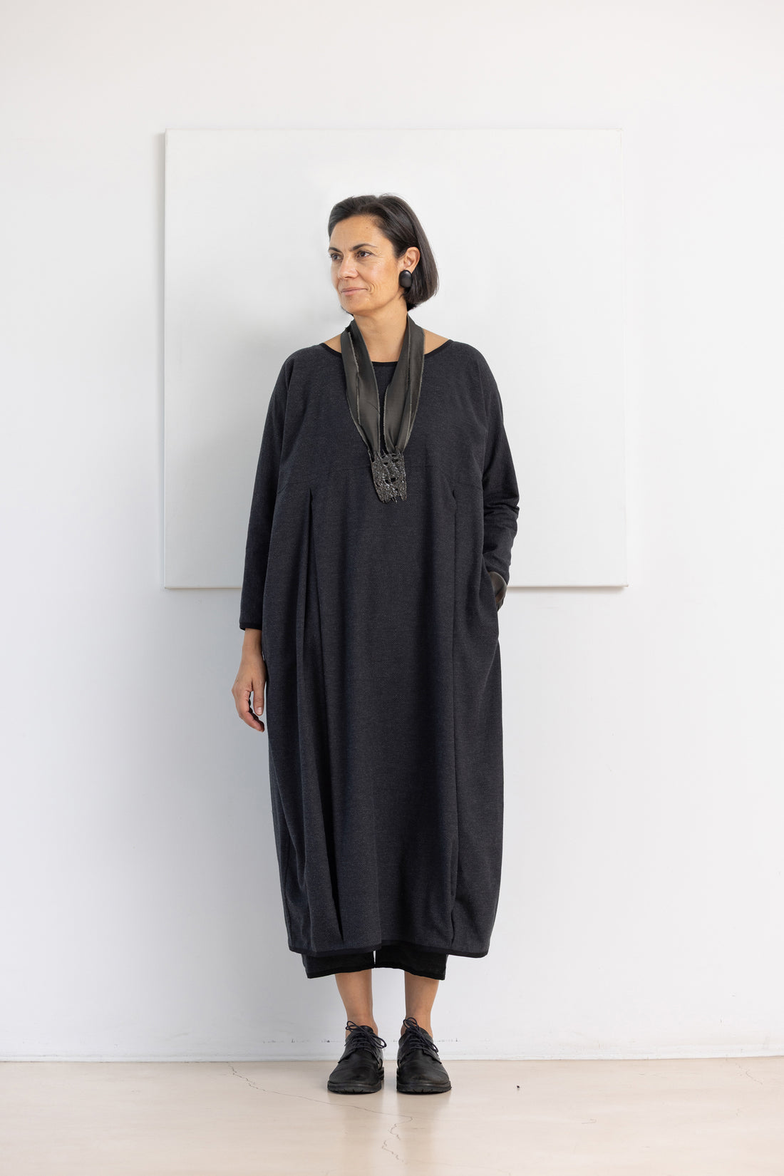 DESCRIPCIÓN - Vestido en tono grafito, confeccionado con una mezcla de algodón suave y cachemira....