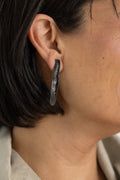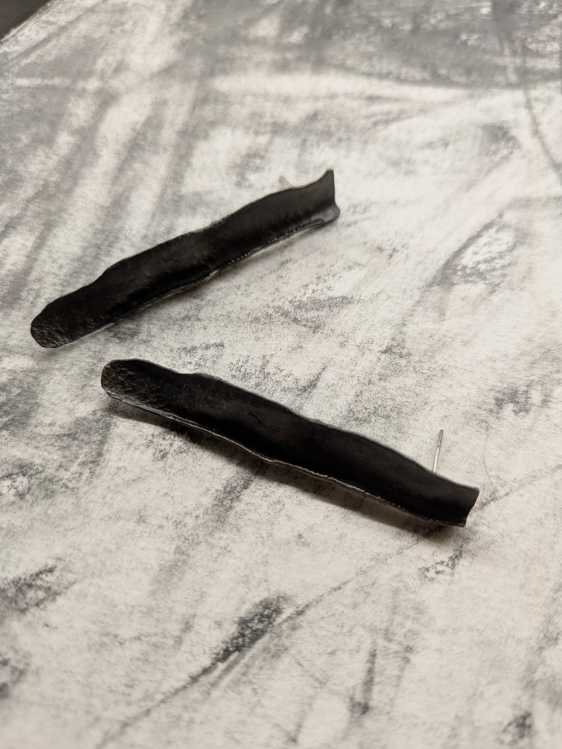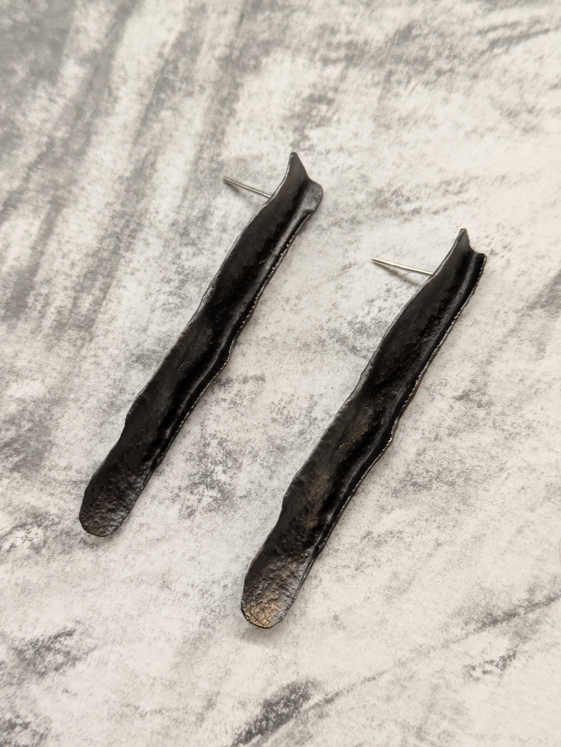 - Pendientes largos artesanales de latón ennegrecido para orejas perforadas, con toques de dorado, que presentan un acabado rústico y una textura irregular.
