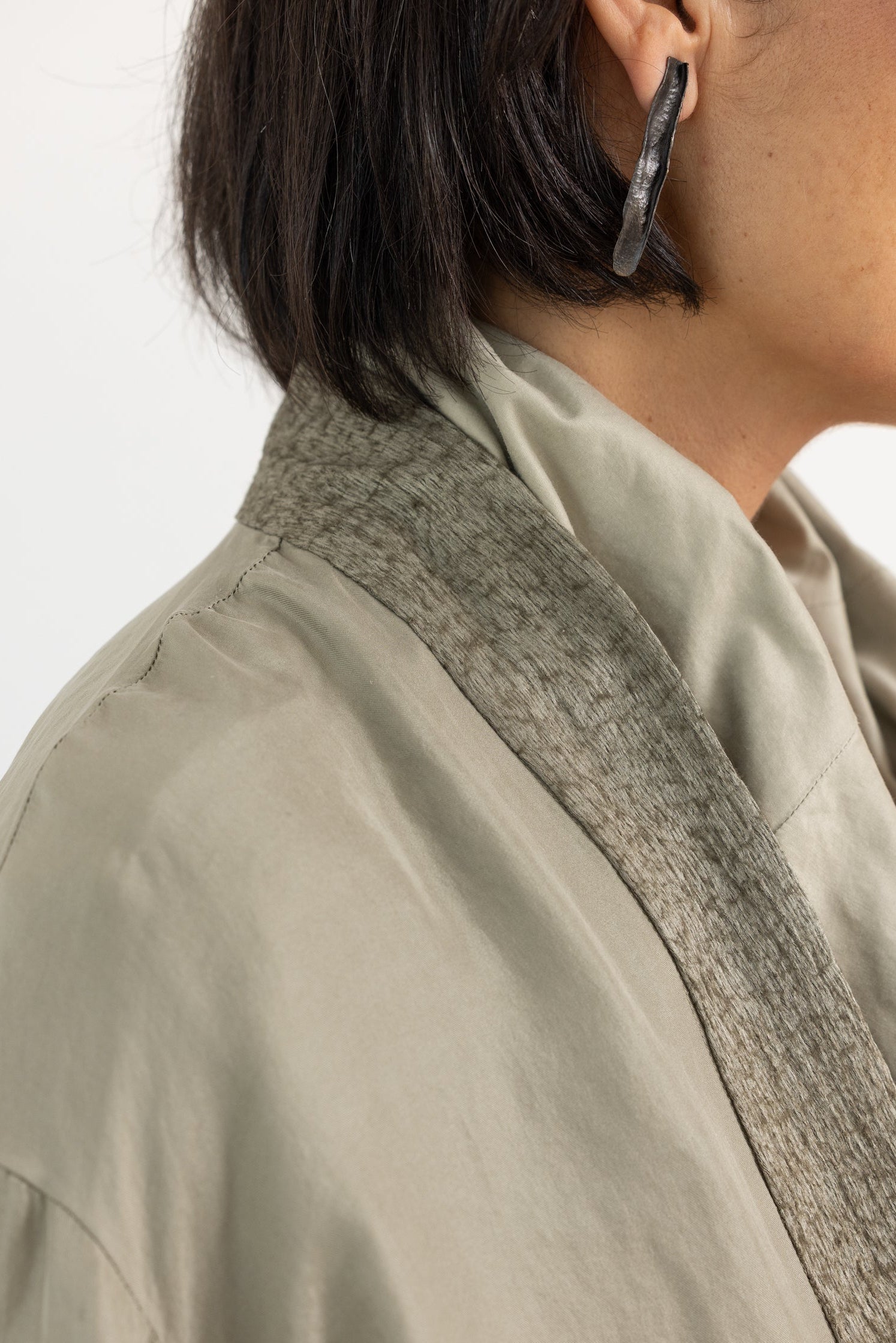 Inspirada en el concepto de MIIYU, la joyera JOANA SANTOS diseña piezas únicas utilizando retales sobrantes de las colecciones de la marca. Aprovechando la riqueza de texturas del textil, la joyera crea joyas versátiles que se pueden estilizar de múltiples formas, invitando al usuario a formar parte del proceso creativo.