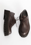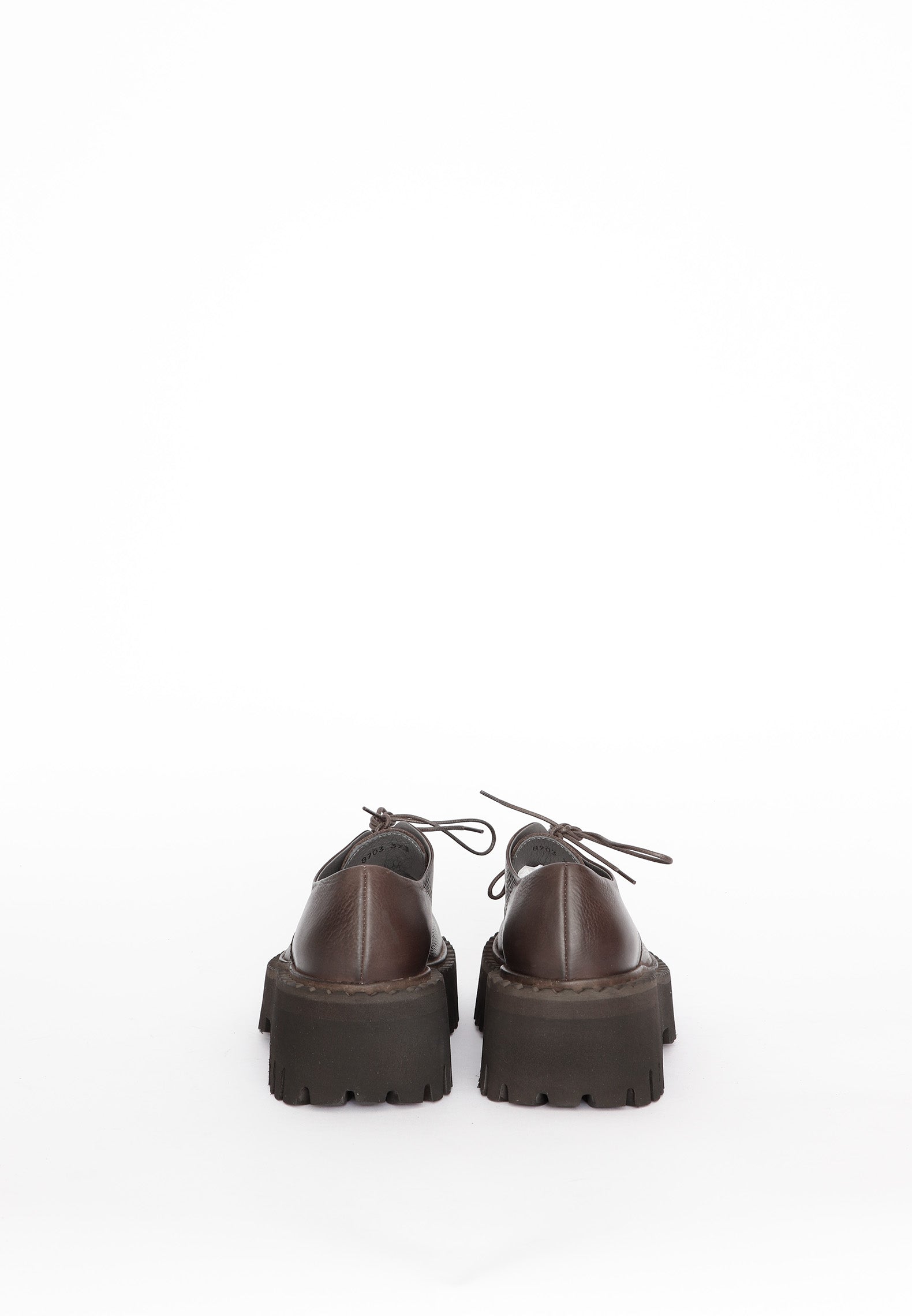 - Sapatos produzidos com couro de bezerro liso castanho escuro, com atacadores no mesmo tom e forrados em couro.