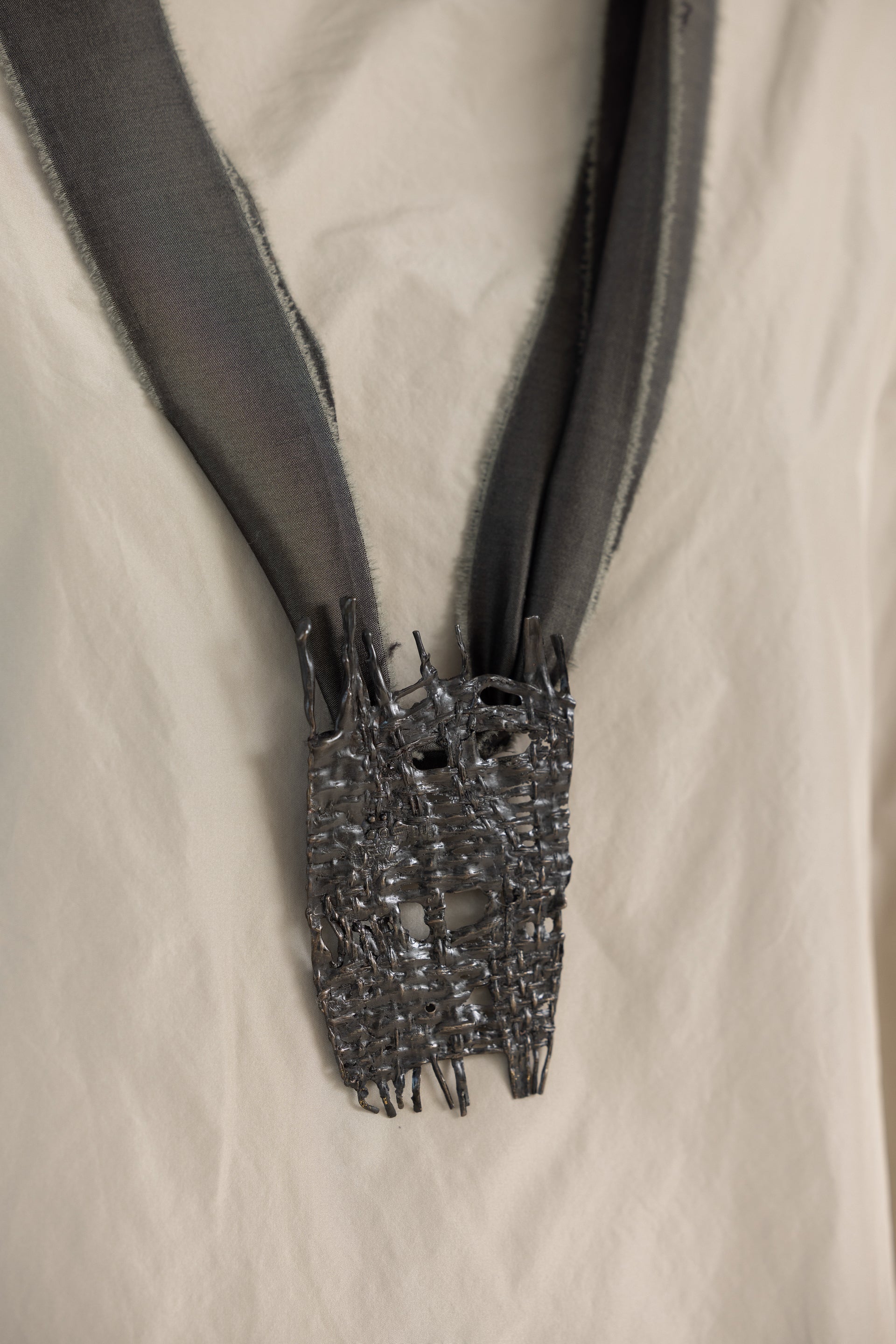 - Colar longo, feito à mão, produzido com fitas pretas de poliester reciclado e placa gráfica em latão preto.
