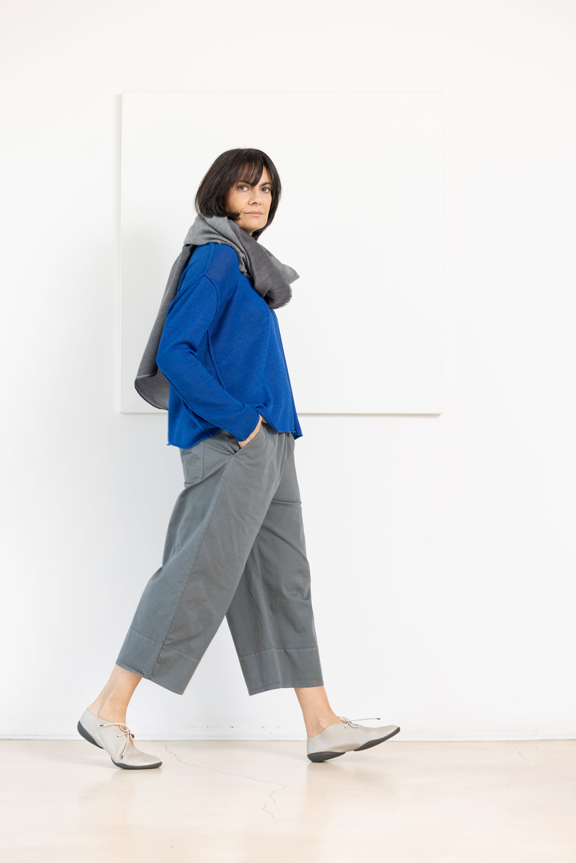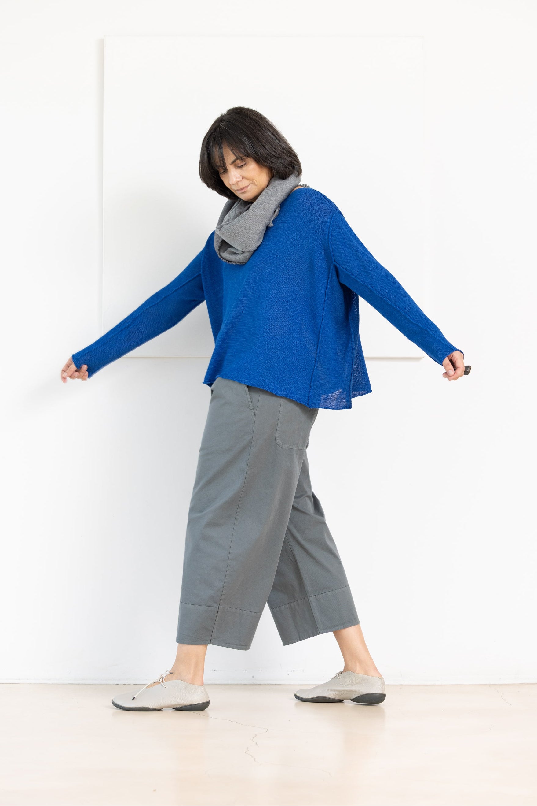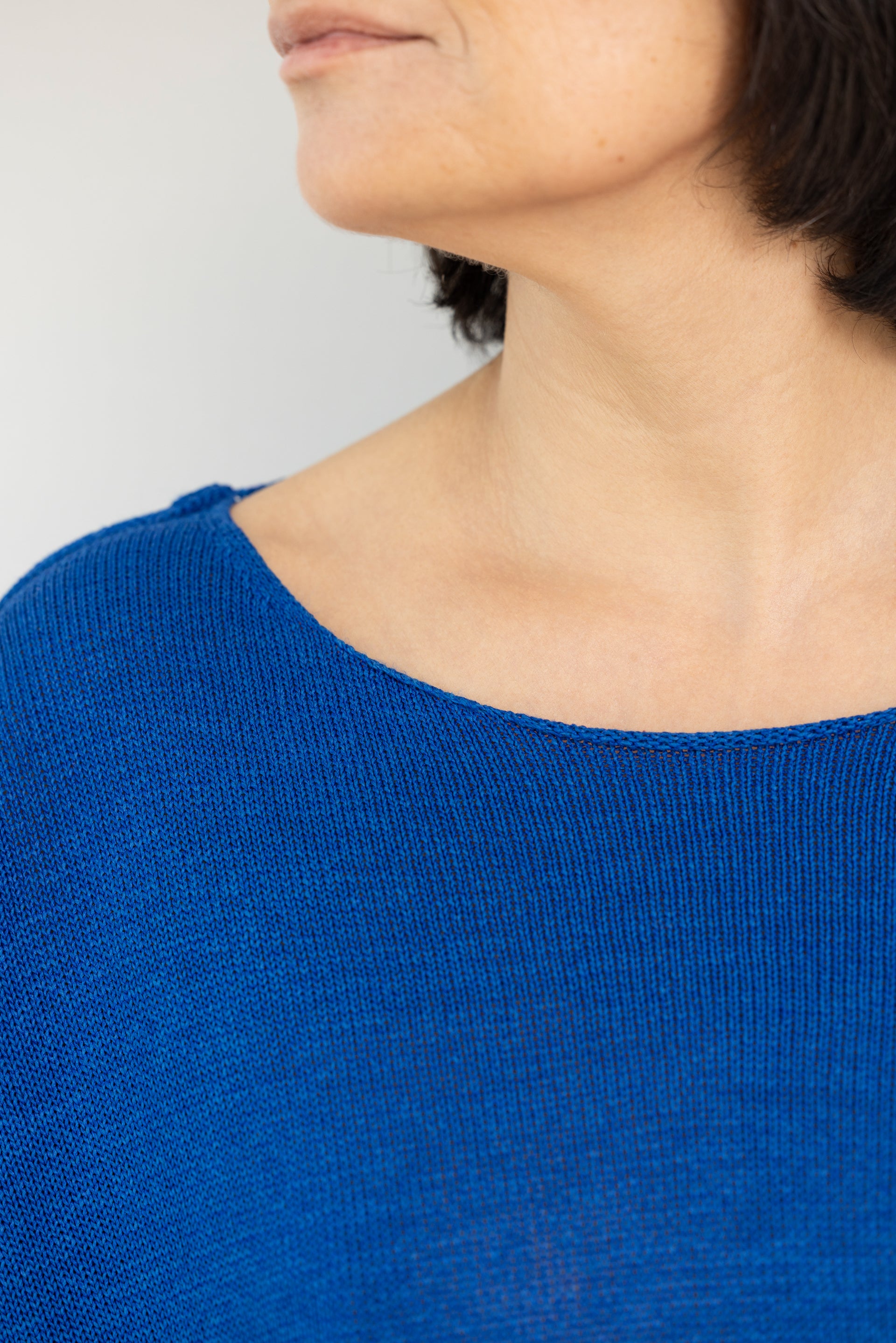 - Decote redondo e ombros descaídos com mangas compridas.